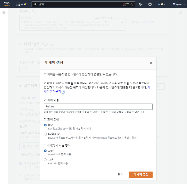 키 페어에서 새 키 페어 생성 버튼을 누르면, 아래의 창이 보입니다.