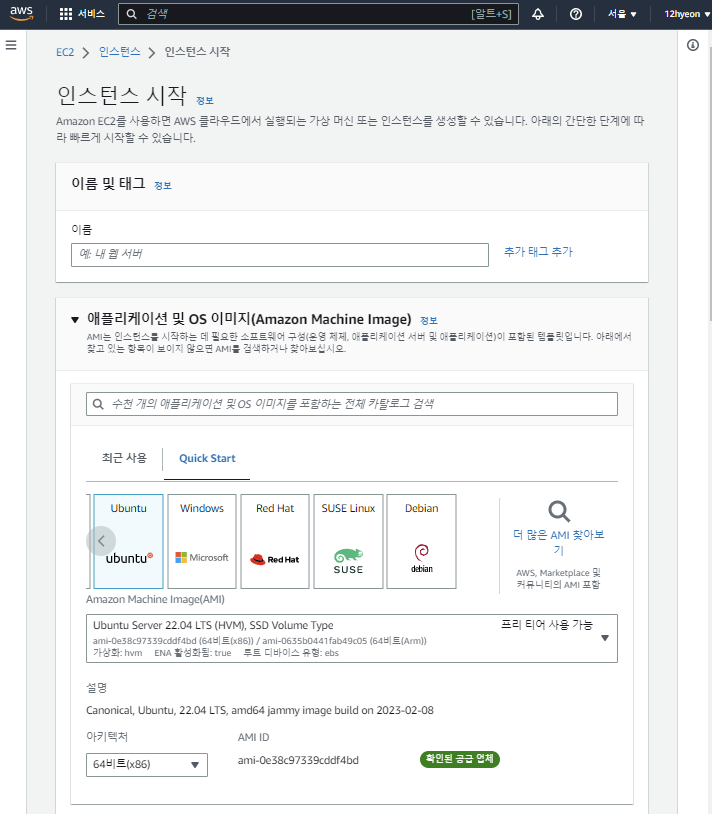 애플리케이션 및 OS 이미지는 Ubuntu를 선택하고, 아래에 프리티어 사용 가능인지 확인합니다.